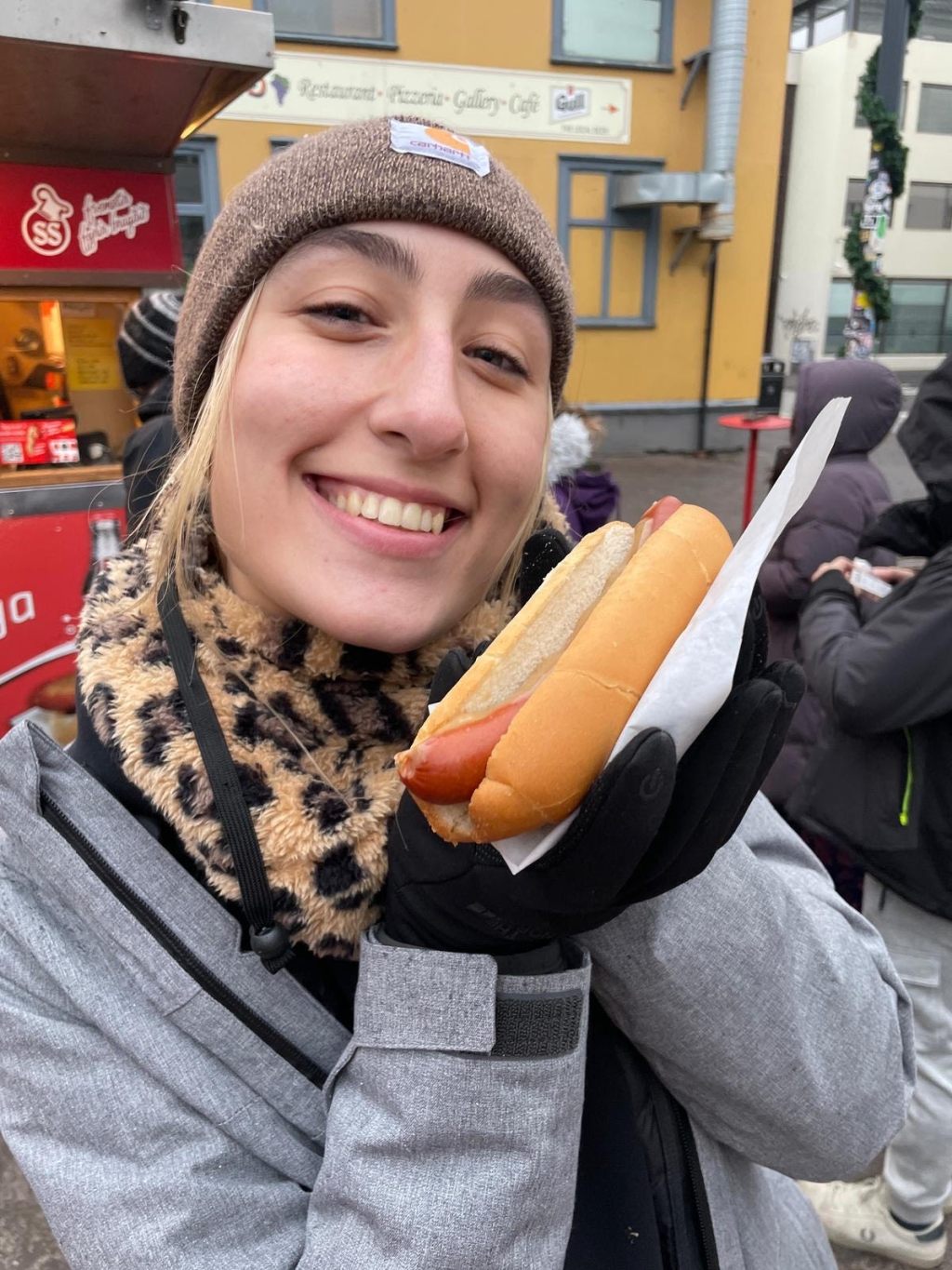 We got into Reykjavik before many of the places were open and we had the chance to see some sights like the Rainbow Road, city buildings, sculptures, and more. It was fascinating that the capital seemed like such a quiet place compared to the bigger cities at home, but it was also early. I tried an Icelandic hot dog! This was adventurous for me because I could be a somewhat picky eater, but you only live once I guess!