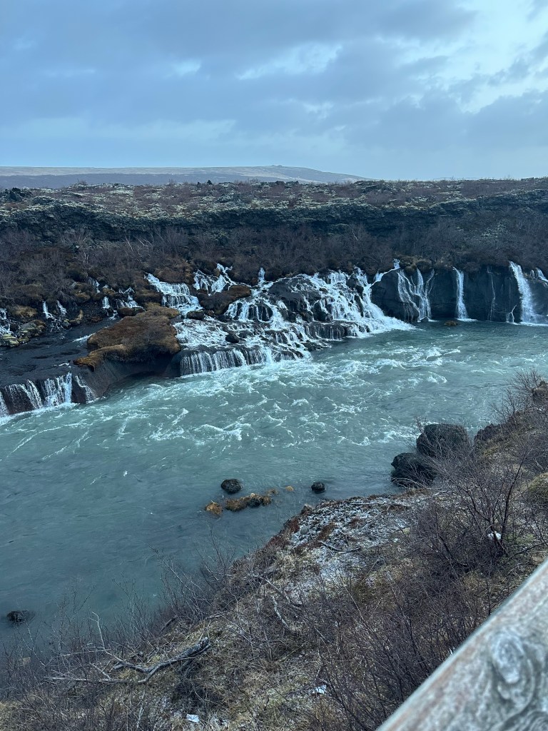 Day 2 in Iceland has ended and it was yet another success, even with the 50 mph winds. We started off today early. I was up at 6:30 to get ready for a full day of being outside. Thank god for thermals! We had breakfast and headed out to Hraunfossar, a series of waterfalls in the highland outfields. It was absolutely breathtaking and a great way to start the morning strong, especially since the crazy weather hadn’t hit yet.