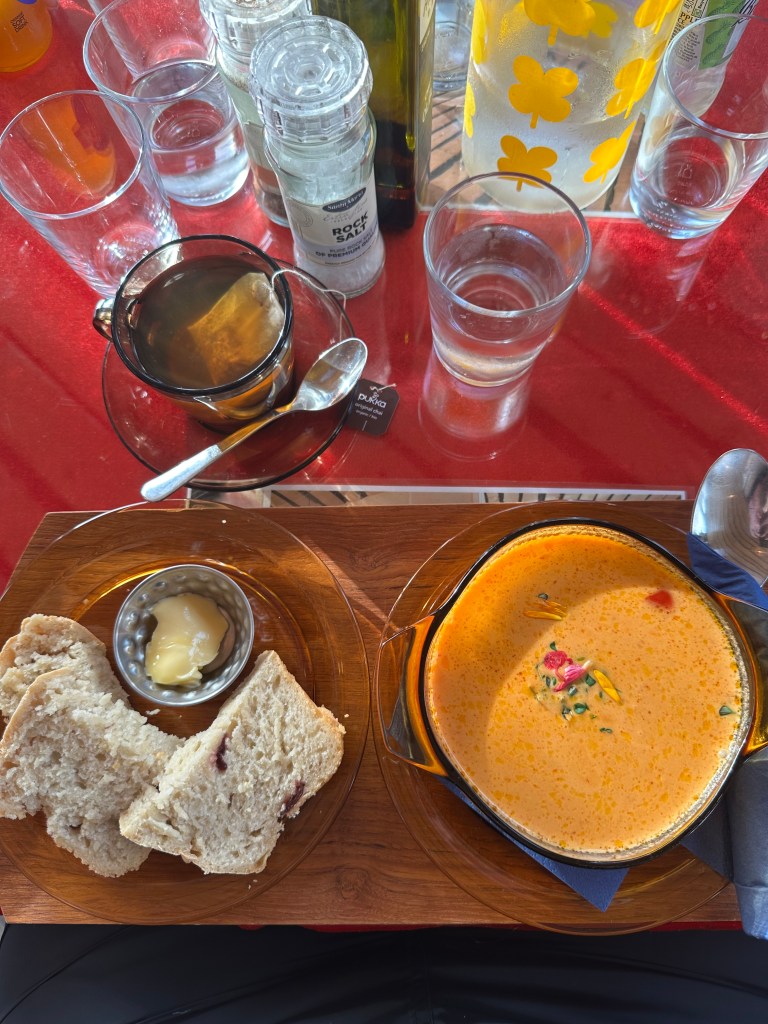 From the beach, we went to a local restaurant and had some very good tomato soup and cranberry bread. While there, we heard about the couple who owns it and how they built the house with their family. They also have a greenhouse that they produce items for themselves and other restaurants around the area, such as flowers. Overall, a very cozy stop.