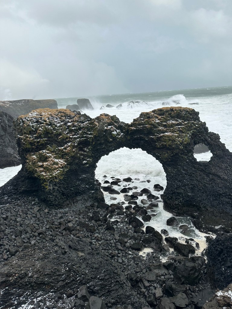 We returned down the peninsula to see Armarstapi and Hellnar, a series of cliffs overlooking the sea and a dock below. Once again, the winds were insane, but the view was incredible. We all couldn’t stop laughing from the wind pushing us all forward. There were giant waves crashing on the coast and launching into the air from the wind, almost looking like a geyser. This was probably my favorite stop of the day. We got to enjoy a bit of a walk while the 50mph winds pushed us forward.