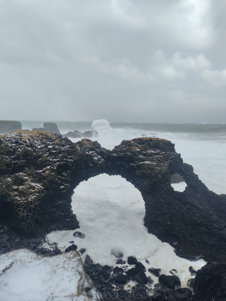 Our second stop in Snæfelles was the Armastapi cliffs, where we saw the Gatklettur, a natural arch formation. We also stopped at the Malariff lighthouse, overlooking more cliffs. However, because of the wind, we didn’t stay too long and had to return. Overall, it was a fun excursion, even if the weather wasn’t cooperative. I’m excited to see more signs tomorrow at Thingvellier.