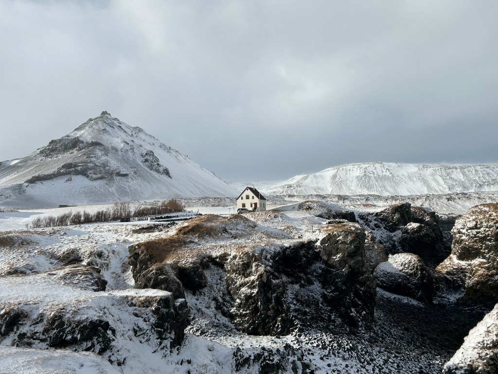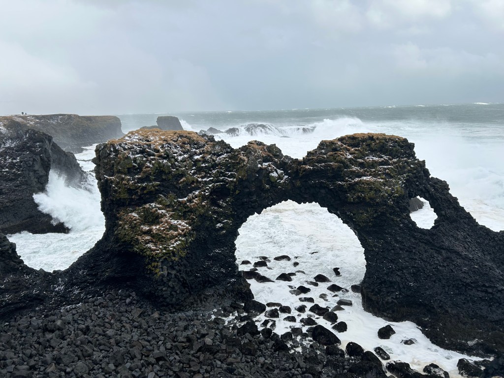 My favorite stop was our first stop on the peninsula, where we walked along a cliffs edge, seeing the rocky coast surrounded by mountains. The weather was insane, with over 50 mph wind and snow blowing onto us, but it didn’t dampen the groups’ spirits at all. We had fun in the wind, laughing and leaning into it, letting it hold us up as it blew around us. When the sun came out, we could see the true beauty around us. Iceland had one of the most unique landscapes I’ve ever seen. Carved out over millions of years by the nearby glacier and constantly changing and growing from the divergent fault lines that run through the country. The coast was black from the volcanic rock, with huge cliffs and formations meeting the sea. Snowy mountains surrounded the tiny coastal town. The powerful sea was crashing into the cliffs, throwing water all the way up to us. I’ll put as many pictures as I can, because I don’t have the words to describe what I saw in a way that does it justice.