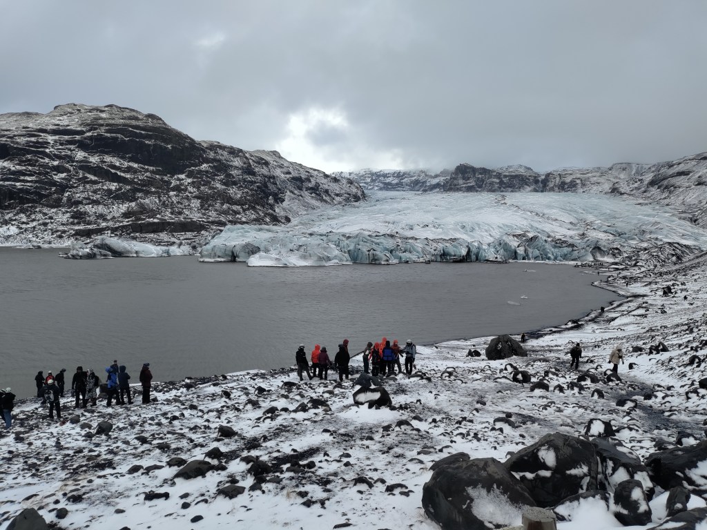 Today we visited Solheimajokull, a popular glacier to visit in the South of Iceland. From the parking lot, we started on a snowy, gravelly path along a lake that had been formed by meltwater from the glacier. After walking about 10 minutes in strong wind, the glacier appeared as we rounded the corner, its blueish-white mass crossing the width of the valley. It was a pretty impressive sight, and it was amazing to see something that could carve through solid rock and reshape the terrain in person. However, what was equally as impressive was how fast the glacier had retreated; just 30 years ago, the glacier had reached all the way to the parking lot we had started at, representing a rate of 1 km in the last decade. This retreat represents what is happening to glaciers all over Iceland; as the climate warms, the total ice volume has been decreasing. This is significant as hydroelectricity provides 70% of the country’s electricity, and glaciers feed many of the largest reservoir. Simply put, losing these glaciers would threaten electricity production in Iceland.