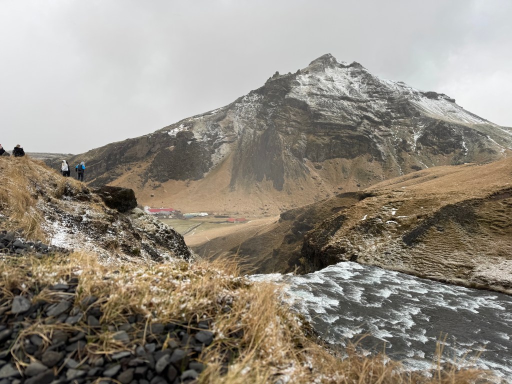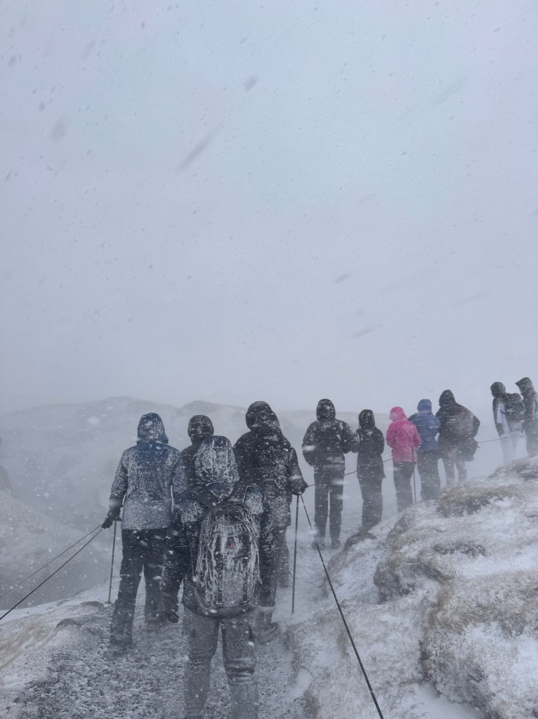 Today we began our day departing the hotel early in the morning and ventured to the Skogafoss waterfall, where we climbed up what felt like a million steps. Climbing up these steps was a pain one, because I am a tall person and love to take two steps at a time, and the average person prefers one step at a time. When we reached the top of the waterfall we began to venture along the highlands and soon got hit with what seems like the usual blizzard at this point.