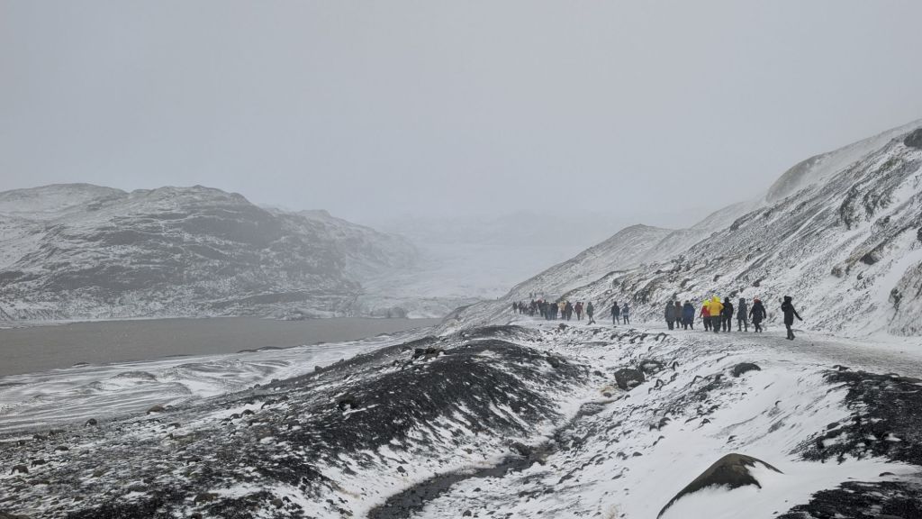 Then it was on to Sólheimajökull, a glacier outlet that was ten minutes from the museum. The glacier was very cool. It generally looks blue, but there were layers of ice that looked gray or black. These were caused by volcanic eruptions throughout time, so we can kinda get a sense of when there was volcanic activity from the glaciers. Additionally, the glaciers have been retreating a lot. Which generally is fine, the problem is that it’s not only retreating but is also shrinking in height and therefore volume at a rapid rate.