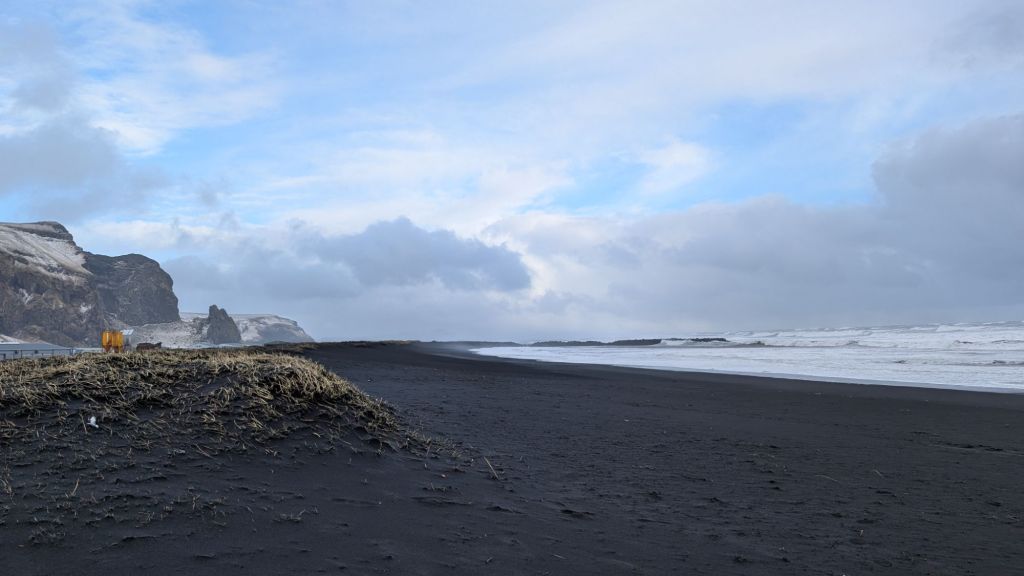 After the glacier, we went to the town of Vík where we got to see a black sand beach. The beach was so windy though that it would blow sand up into your face and eyes. I stayed out long enough to see the view, walk on the beach, take a couple photos, and then leave. We had some tasty pizza then at a nearby pizza place where they had black crust and sourdough crust pizzas.