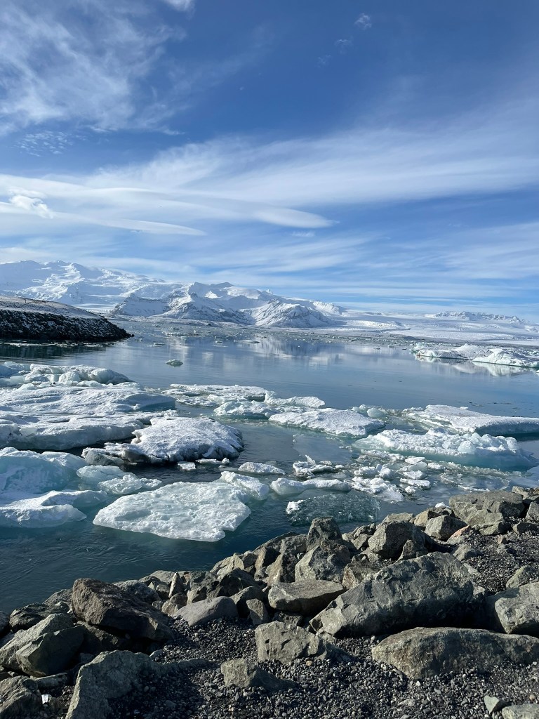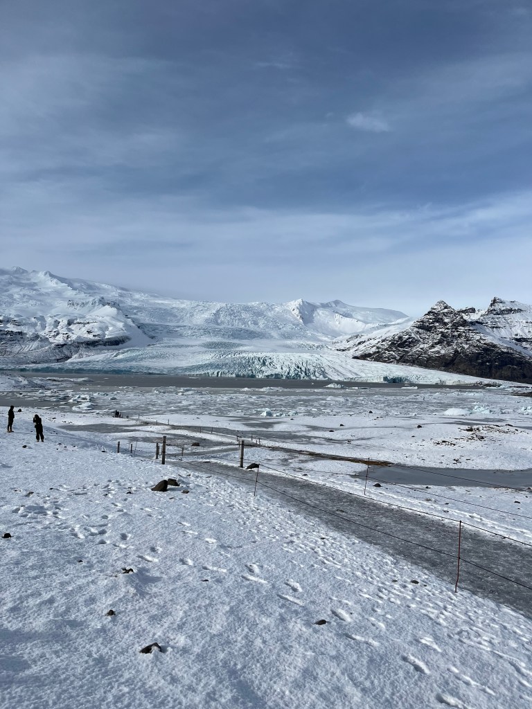 We then visited the glacier Breiðamerkurjökull from two perspectives. The first was a smaller portion of the glacier wedged between two mountains. The second was at the black sand beach and diamond lagoon of Jökulsárlón. It was beautiful outside. The sun shined as the waves crashed on the coastline and seagulls searched for fish within the shallow waters.