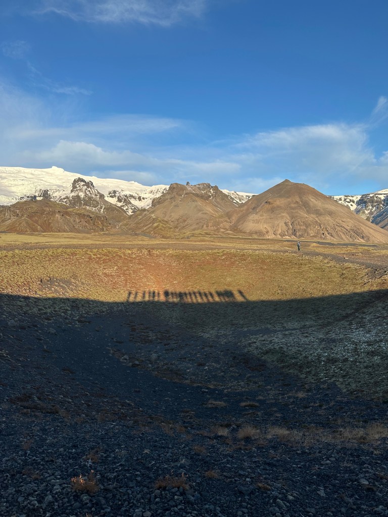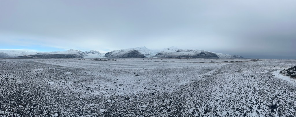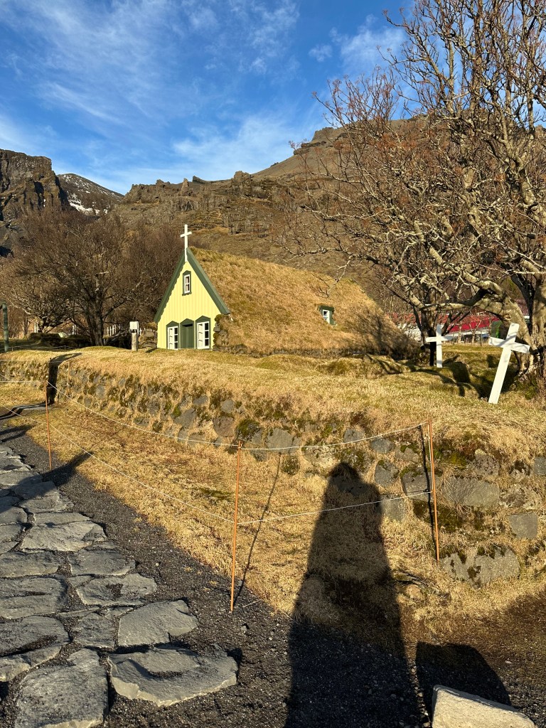 On the way back to the hotel, we made two more stops. One to see a historical church built with turf and stone, and the second to see the effects of glaciers melting. The church had a small graveyard. Ólöf told us how they used to raise a ghost from the dead to do their bidding. The second location had a huge hole in the ground form the glacier moving in and then melting. While it didn’t seem like much, it was definitely another cool thing to see.