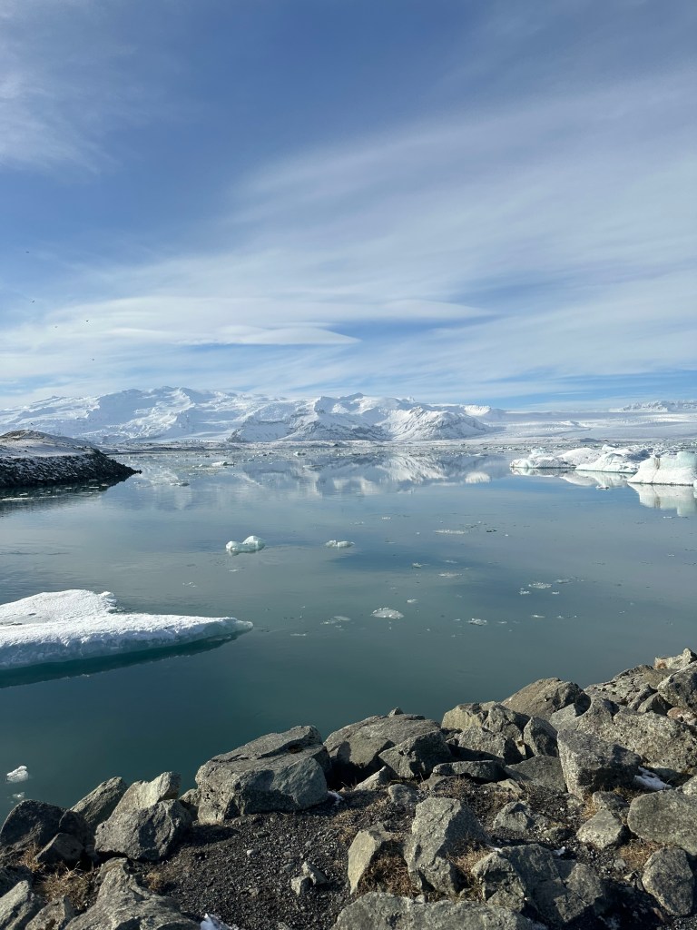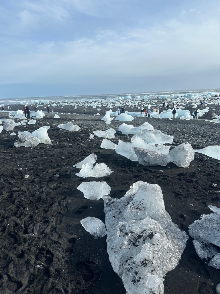 We then headed to our last major stop of the day, Lagoon Jökullsarlon and the Diamond Beach. This is the largest glacial lagoon in Iceland and a black sand beach pushed up against one another. The beach was stunning and looked like giant crystals on the dark sand. The lagoon was incredibly clear and reflected the mountain perfectly. It all looked like something out of a painting. There were seals on the icebergs in the lagoon and we all got an opportunity to wander around and take in the sights. Definitely the best stop of the day!