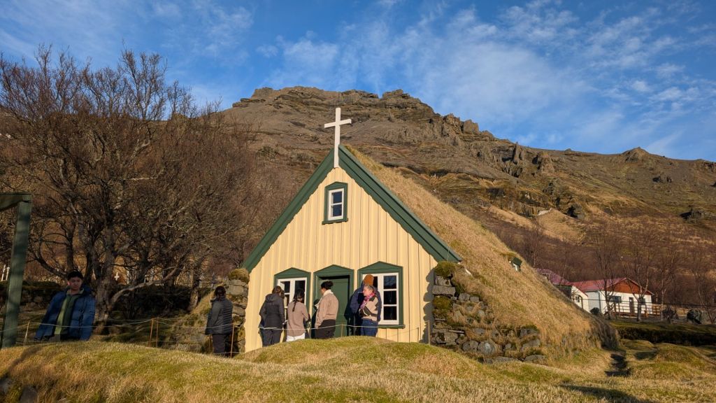 On the way back, we stopped at a Pagan church that was converted to a Catholic church when Catholicism took over. It had a turf roof. We also learned while there about Icelandic ghosts and how to essentially create one based on the Icelandic stories, would not recommend doing so personally, does not sound fun. We also learned that Iceland doesn’t have any traditional stories about witches, but that they believed that the Priests were magical. Our last stop of the day was at a crater on the way back, which was very large and crater-ous.
