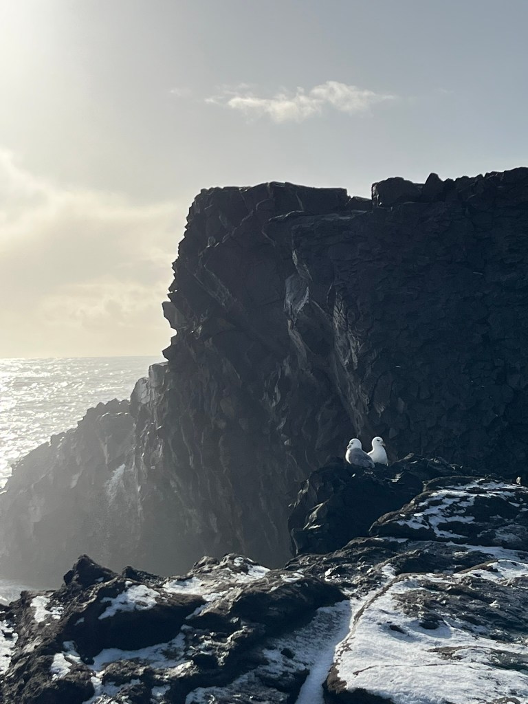 We then visited cliffs that overlooked Reynisfjara. There was a natural archway formed from the waves interacting with the cliff face. The cliffs formed from basalt and other rock formations.