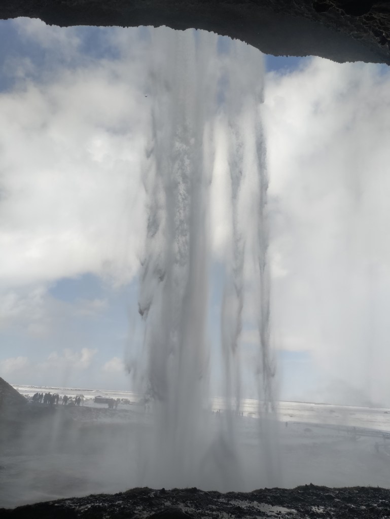 Today was more of a travel day, as we drove from Klauster to Reykjavik. We stopped at the Reynisfjara beach, where massive waves crashed onto the shore. Each wave was at least the height of a person, and we were informed by our guide Olof that several tourists had even been washed away by the waves. With the freezing cold water around Iceland, this was basically a death sentence. There was even a traffic light system, with green meaning relatively safe conditions, and red meaning dangerous conditions, with the possibility of waves reaching the parking lot. Because of this we stood back, far from where the waves were crashing onto the black sand of the beach. We then drove to the Seljalandsfoss, a large waterfall that you could walk behind. I’m glad that I got my snowpants from my suitcase as there was tons of mist that would have soaked anyone that didn’t wear proper clothing.