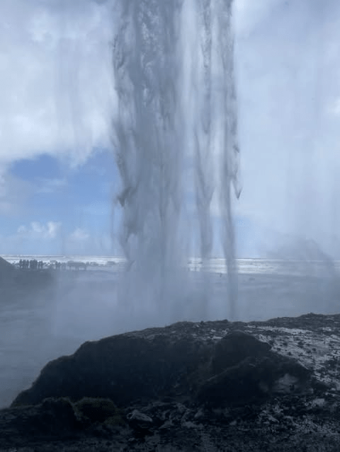 Seljalandsfoss, a waterfall with a 60 meter drop, was our next stop. I was looking forward to this stop because we could walk behind the water. I enjoyed my time at the waterfall because of the breathtaking scenery. Despite my effort to stay dry using my waterproof gear, I still managed to get drenched.