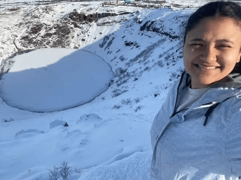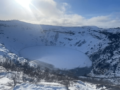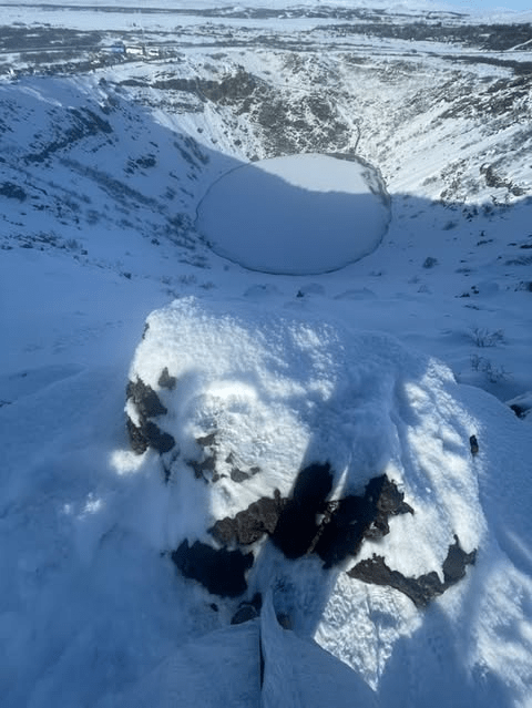 The last stop before Reykjavik was the Kerid Crater. The crater was a cone-shaped volcano which is believed to have erupted and exhausted its magma reservoir. The eruption caused the volcano to collapse on itself ultimately resulting in the large crater. I enjoyed walking around the crater from above as the scenery was stunning to observe. Dr. Barry started rolling snowballs down the side of the crater and into the frozen lake. I photobombed another tourist’s selfie and when he realized, based on his laughter and excitement, he thought it was really fun. I asked if I could see the photo (unfortunately I forgot to ask for it) and he said it turned out wonderfully. I learned that he was from Holland. He said I should visit the impressive canals throughout the country. We had a lovely conversation about Holland and how I should visit at some point. I promised I would go as soon as I finish my degree.