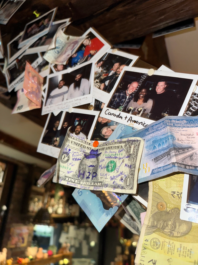 After dinner, Mae, Antoinette, Carson and I decided to decorate a dollar bill for the restaurant’s postcard, polaroid and bill wall. We gave George Washington a mustache which made him look French and what was initially a top hat transformed into a cowboy hat for a bit of southern America representation. I wrote “TO NEW FRIENDSHIP” in the top left corner accompanied by the date on the bill. Antoniette wrote “H2P” on George Washington’s chest. We asked our classmates, Dr. Barry and Nora to sign the dollar along with Olafia and some of her colleagues. We hung up the dollar in hopes that when the programs reruns next spring break, those students can hang their dollar next to ours!