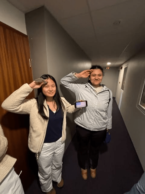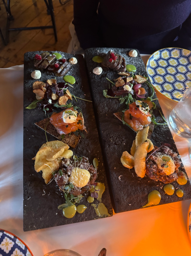 Once we arrived at the hotel, I was feeling oddly patriotic and missing the United States. Mae and I saluted to the national anthem for a couple of moments as our classmates settled into their rooms. We had a 40 minute walk to downtown Reykjavik so we could get to our restaurant for the night. Once the starters were served, I still could not break my fast so I enjoyed talking to the serving staff and learning more about them. I learned our server, Olafia, Icelandic for Olivia, was going into her last year of junior college before she could proceed to University. At 7:02 PM my fast for the day was complete and I broke it with some dates and shortly after I tried the horse tartar. I have no frame of reference to describe this dish as it was extremely unique. Eating the horse though made me feel sad since the other day I befriended some Icelandic horses. Carson said the horse tartar was his favorite dish and I just had to remind him of the horses we saw the day before. I then followed the puffin, the texture was quite unique resembling that of a soft cheese. Next, I tried the smoked char which was served on traditional Icelandic flat rye, Flatkokur. I enjoyed the depth of flavors on my palette, but my favorite was the lamb dish. I think this was the case because it was the protein I was most familiar with. I enjoyed learning more about Icelandic culture through these new foods as this experience was eye opening and unlike anything I have ever done.