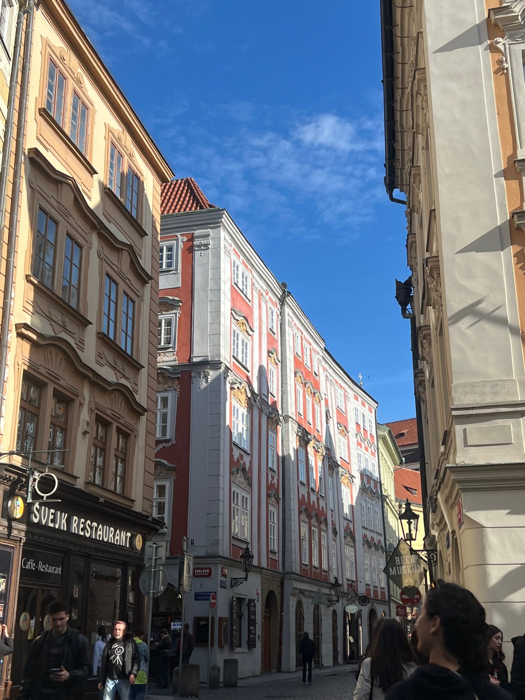 Today was a very long but incredible day. With only the few hours that we were in Prague, I already noticed so many differences in my life at home vs here. One meaningful conversation I had with quite a few people was about languages. I noticed how normalized it is for Europeans to know English, but then most Americans don’t know other languages. I think that is a very privileged position for us to be in, however it does feel like I am being disrespectful expecting the locals to speak my language. Additionally, cultural differences such as noise level when walking through the street has been very noticable already. It was shocking to see how quiet a city center truly could be. This is something I have thought about before, however being here today has exasperated the realization of how almost every European speak English, as well as other languages. Also, the Charles bridge was an incredible view. Practically it is just a bridge to walk over, but it has an abundance of history. I am very excited to go across it and learn about it more.