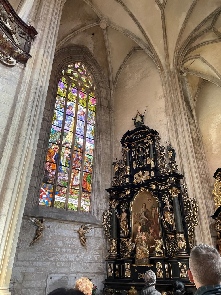 Our next stop of the day was St. Barbara’s Church. Looking at it from outside, I noticed the unique supporting arches on either side of the building. Our guide Jana explained to us that as repairs and upgrades were being made, the structure needed more support, hence these members. As a civil engineering student, I found this quite interesting. When we went inside the church, I was in awe with its beauty. The stained glass art was mesmerizing, as well as the ceiling. All of the light that could be let into the church was said to be God entering the space. This was easily one of the most remarkable churches I’ve ever visited, and an incredible space to exist in. The intersection of art and engineering here was super interesting, and I plan to do some more research on the matter!