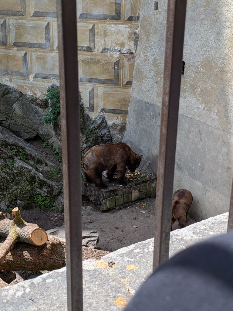 This was a rather common practice across Bohemia historically, though new laws have been put in place to phase-out the program and cease the replenishment of bears to the moats once they die of old age. These two bears are actually Russian, and were seized at Václav Havel airport en route to elsewhere in Europe likely for sale into a circus.