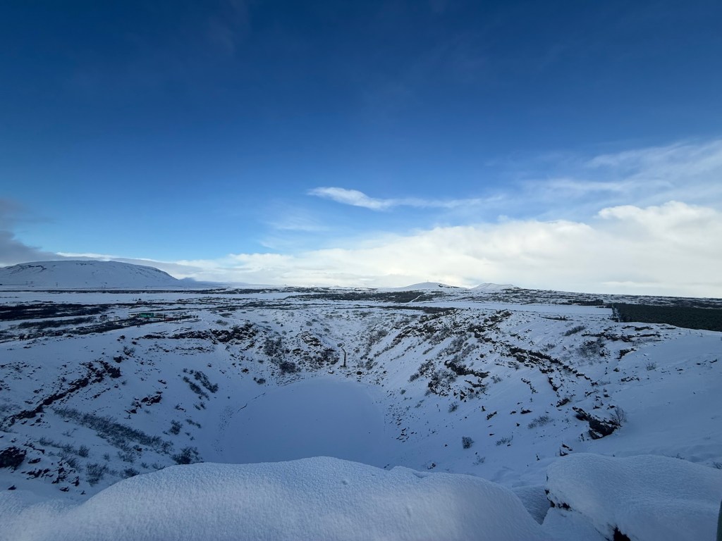 On our way to the hotel we visited Kerið Crater, which ended up being my favorite moment of the day. The entire crater was covered in snow and the water inside was completely frozen, which made the whole place look like something out of a winter movie. This was also the first time we used our crampons so we could safely walk on the icy paths. Walking the full loop around the crater while looking out over the snowy landscape was incredible. Between the wind, the ice, and the huge views, it really felt like a true Iceland experience.