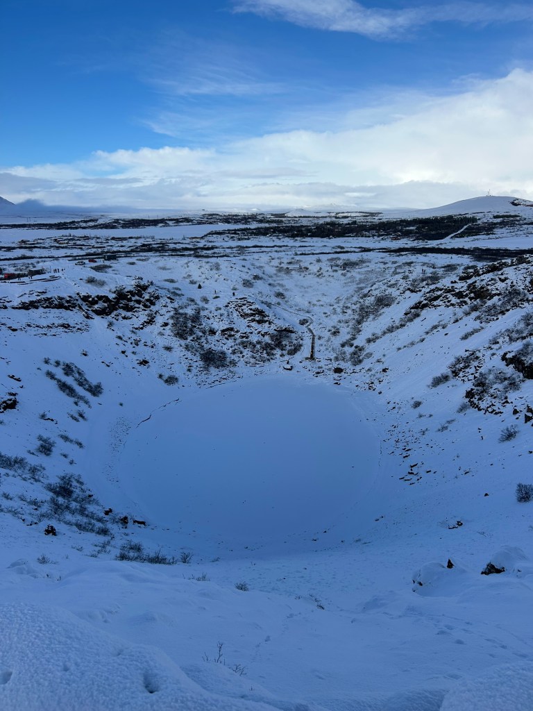 From Laugarvatn Fontana we visited a rural farm for Icelandic ice cream and got to see the cows that provided the milk. Then, finally, the sun came out, and we made a surprise visit to the Kerid Crater! It looked so different from all the photos I’d seen on the internet. Apparently Iceland is extremely different in the winter than in the summer. The lake was entirely covered in snow, but when we got to the top of the ridge we could see for miles – plains and pine forests, with mountains in the distance. Truly a winter wonderland!
