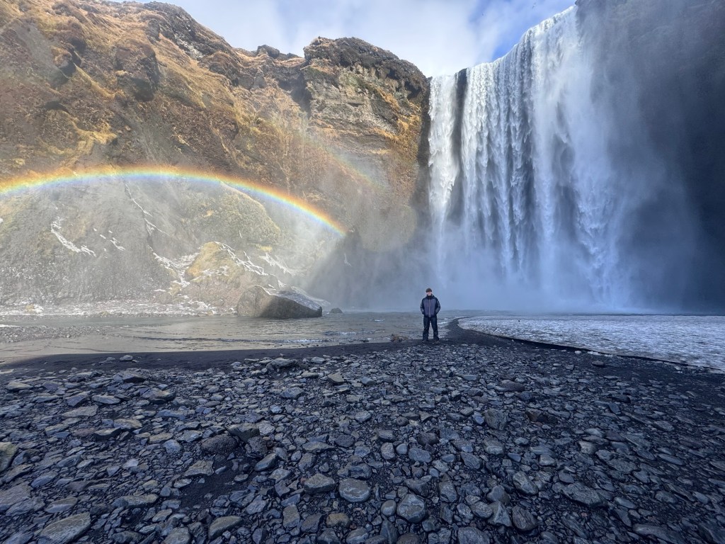 Next, we visited another famous waterfall, Skógafoss. This was definitely my favorite waterfall of the entire trip. After a short rain shower, the sun came out and created a bright rainbow right at the base of the waterfall. We hiked up the stairs to the top and continued along the trail where we were able to see several more waterfalls and incredible views of the surrounding landscape. This hike ended up being my favorite part of the whole trip.