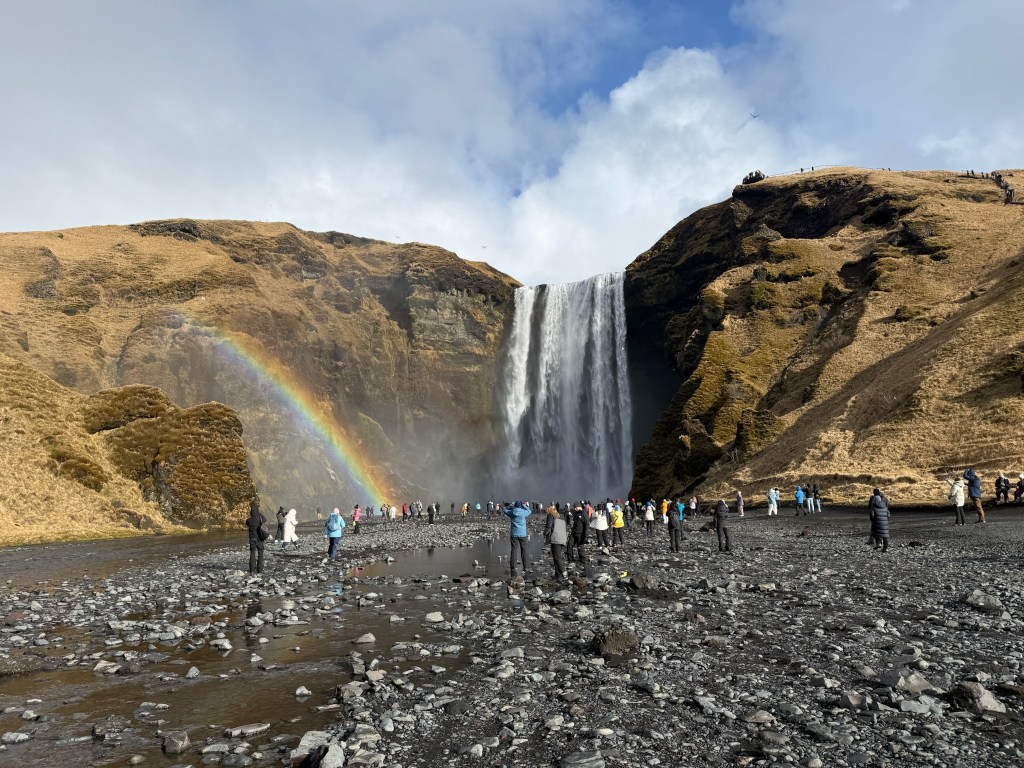 After visiting Seljalandsfoss, we visited another waterfall close by. The next waterfall we visited was Skogafoss. During our time at Skogafoss we were allowed to walk under the waterfall and above it. When we first approached the waterfall there was a rainbow at the base that was close enough for us to grab at. We spent around a hour and a half there and by the time we were done all of our legs were sore from walking up the excessive amount of stairs. After visiting Skogafoss, we visited a folk museum. At the folk museum, we got to learn about a lot of the history of southern Iceland. The employees showed us old Icelandic relics, houses, and Icelandic boats. Along with that they also showed us other old relics. They showed us numerous old cars, snow mobiles, radios, phones, and planes. Seeing the whole museum took almost 2 hours. Our final visit was to the Solheimajokull, a glacier that is melting at an incredible pace. The blue ice from the glacier could be seen from where we park which was around a mile way.