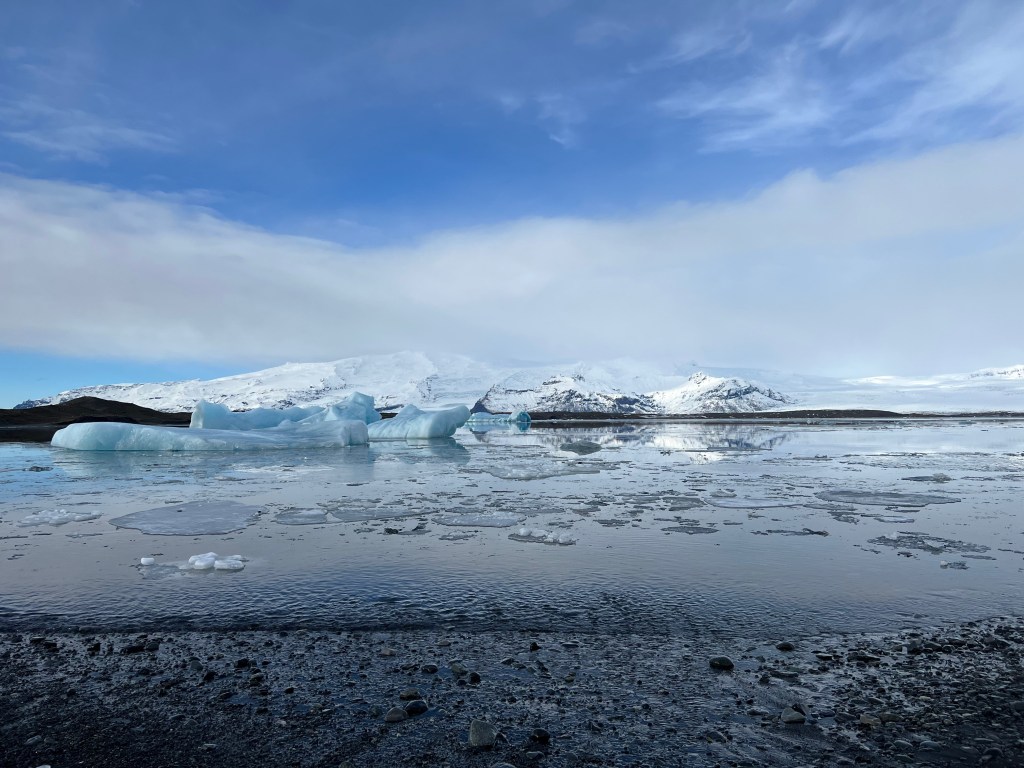 We began Day 5 with a trip to the Jökulsárlón glacial lagoon, where we admired stunning views of the glacier and the blue icebergs floating along the lake (with the occasional harbor seal resting on the ice). These icebergs melt quickly once they detach from the glacier due to the higher temperature of the seawater that enters the lagoon. As a result, they are quite unstable and can break easily, so… no climbing. I enjoyed collecting rocks along the beaches of the lagoon and tried hard to think back to my geology class where I learned how to identify igneous rocks. While at this site, we also visited Diamond Beach, a black sand beach where pieces of icebergs have washed ashore. The contrast between the crystal blue ice and the black sands is beautiful, and the ice chunks really do look like diamonds. Unfortunately, due to strong easterly winds and rough waves, some of the black sand beaches have experienced significant erosion. However, there are recovery efforts in place that are mitigating the effects. Just more proof that Iceland’s landscape is constantly changing!
