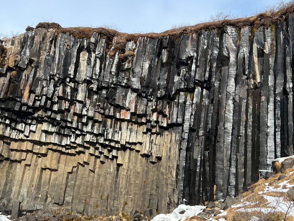 After the glacial lagoon, we drove to another area of the Vatnajökull National Park and hiked to a waterfall surrounded by basalt columns. These rock formations are fascinating. Basalt is an igneous rock that is deposited as lava during volcanic eruptions; as the lava cools and solidifies, cracks begin to form. Basalt is unique because the cracks that form in this rock create vertical columns with five to seven sides. After today, I have a new understanding of why Iceland is called the Land of Fire and Ice!