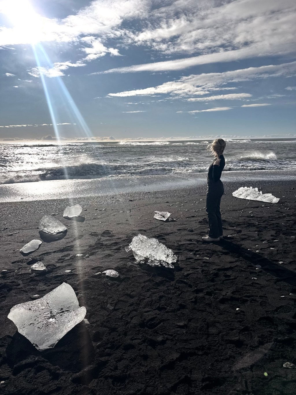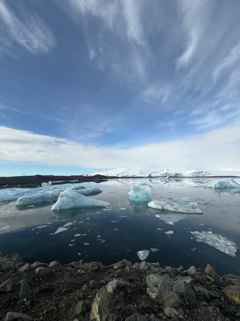 After breakfast we got on the bus for about an hour and a half drive toward Jökulsárlón Glacier Lagoon in Vatnajökull National Park. We first stopped at Diamond Beach and the glacier lagoon and the views were absolutely breathtaking. The lagoon forms when pieces of a glacier break off in a a process called calving. These chunks of ice float through the lagoon and eventually drift out to the ocean. Waves then wash some of the ice back onto the black sand beach, which is why it looks like sparkling diamonds sitting on the sand. It honestly looked different everywhere you turned.
