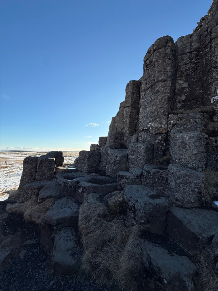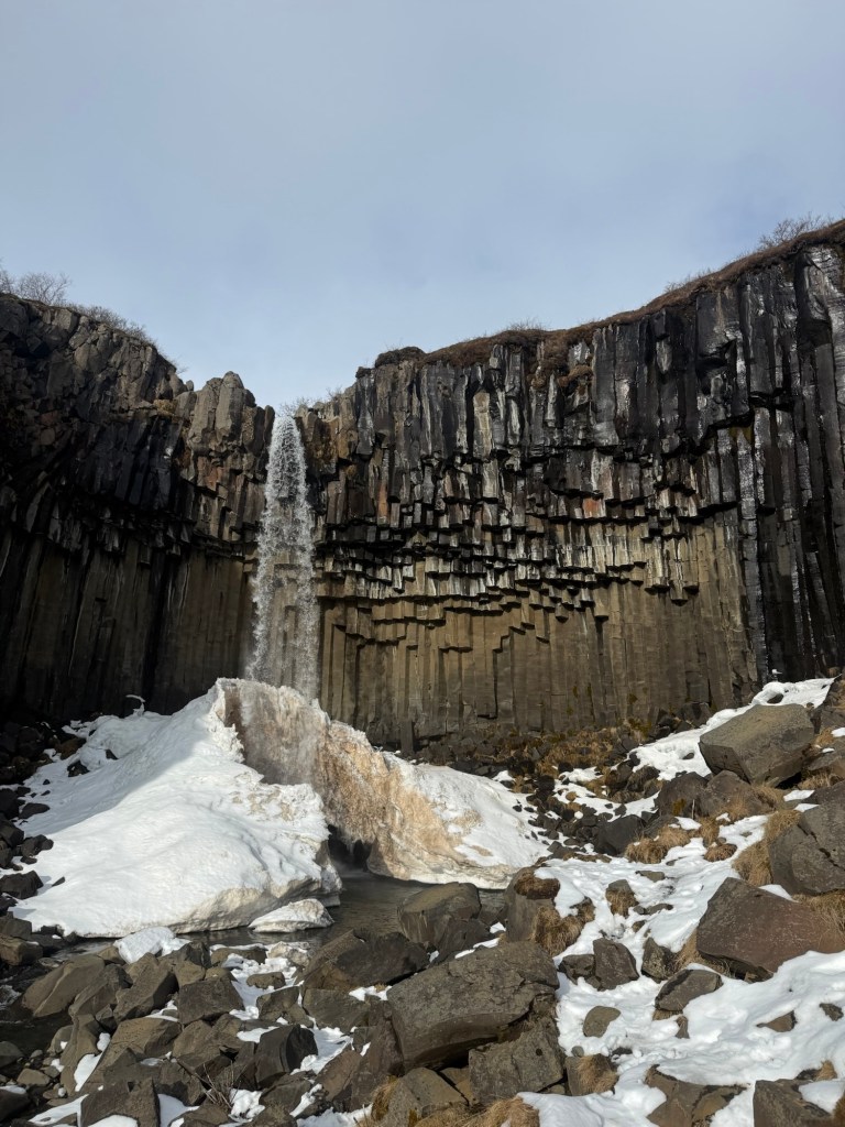 Later we stopped at an area with amazing basalt columns similar to those seen near Svartifoss. These columns form when lava cools slowly after a volcanic eruption. As the lava cools and contracts it cracks in geometric patterns, often forming tall hexagonal columns. It is a natural example of physics and cooling patterns happening in rock.