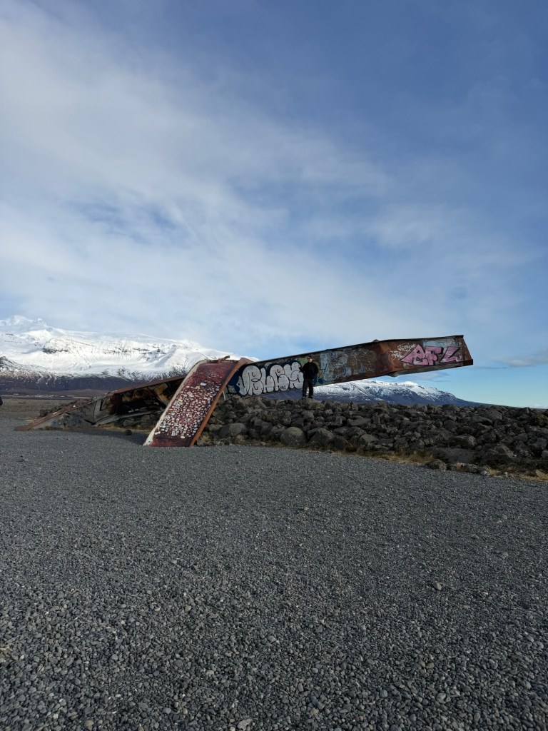One stop was to look at a twisted metal bridge that was destroyed during the 1996 Skeiðarársandur glacial outburst flood. In 1996, volcanic activity under a glacier caused a massive glacial outburst flood called a jökulhlaup. Water that had been trapped under the glacier suddenly rushed out, carrying huge chunks of ice and debris. The force of the flood was so powerful that it bent the steel bridge and completely destroyed the road. We also got to see Hvannadalshnúkur, which is the tallest mountain in Iceland at about 2,110 meters. It sits on the edge of the Vatnajökull glacier and shows how glaciers and volcanoes shape Iceland’s landscape