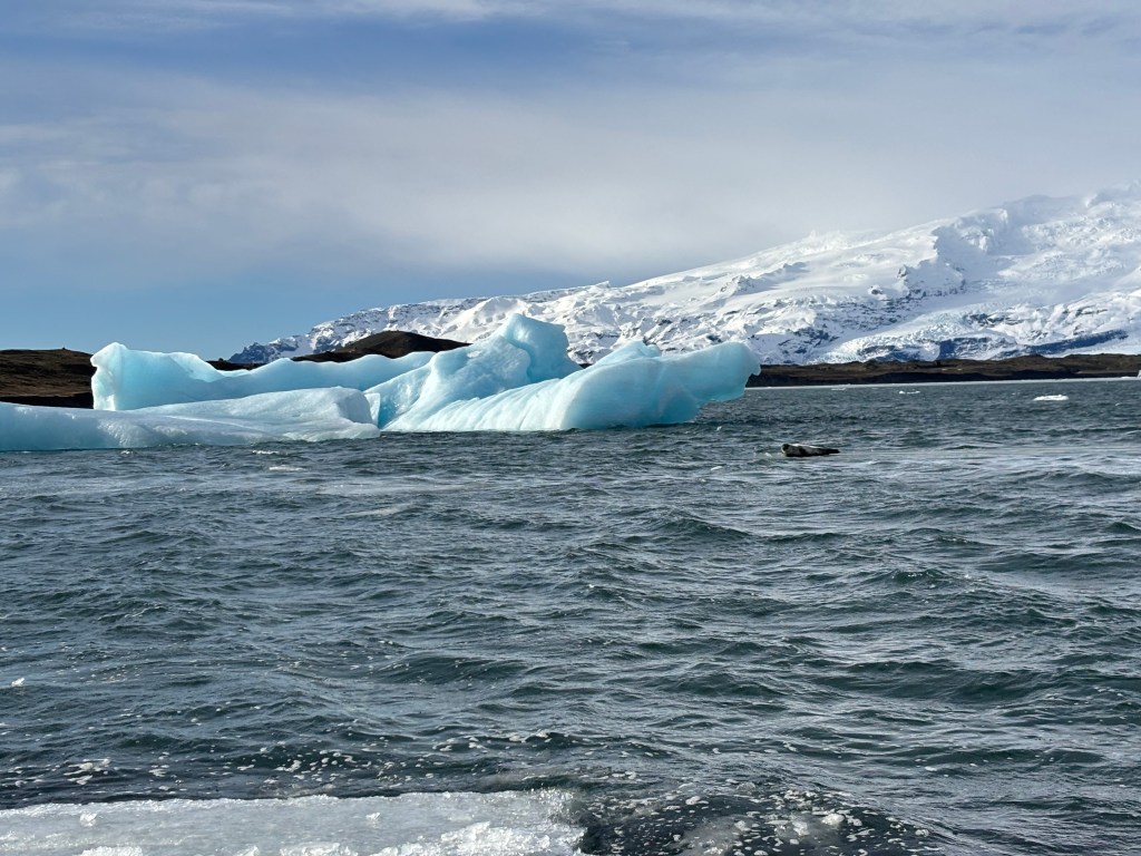 Our first stop was Jökulsárlón Glacier Lagoon. Huge pieces of ice break off from the glacier and float through the lagoon before eventually reaching the ocean. The ice was different shades of white and blue, and some of the pieces were huge. One of the coolest moments of the day was spotting a seal sitting on one of the floating ice chunks. It honestly felt like something straight out of a National Geographic episode.