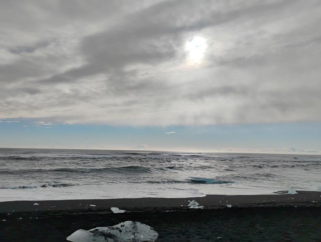 One thing that’s really unique about Jökulsárlón is that it’s parent glacier, Breiðamerkurjökull, used to extend all the way into the ocean. That mean that Jökulsárlón lagoon outlets into the ocean, giving you an amazing dual beach where the shores of the lake are strewn with ice and look like the picture above, while the oceanic side has an amazing black sand beach like the picture below, as well as washed-up ice that exited the lagoon. Jökulsárlón’s oceanic beach is actually known as Diamond Beach because of the polished, shining ice chunks that wash up on it.