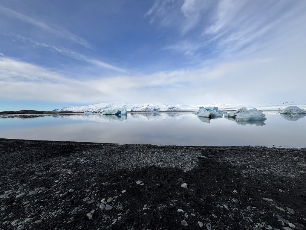Today we started our day out with breakfast at the hotel then we went to go see a glacial lagoon. The lagoon had large ice chunks floating in it with seals coming up for air in the harbor. Also, the lagoon goes out to sea leading to the calved ice chunks washing ashore. This gives the beach its nickname diamond beach.