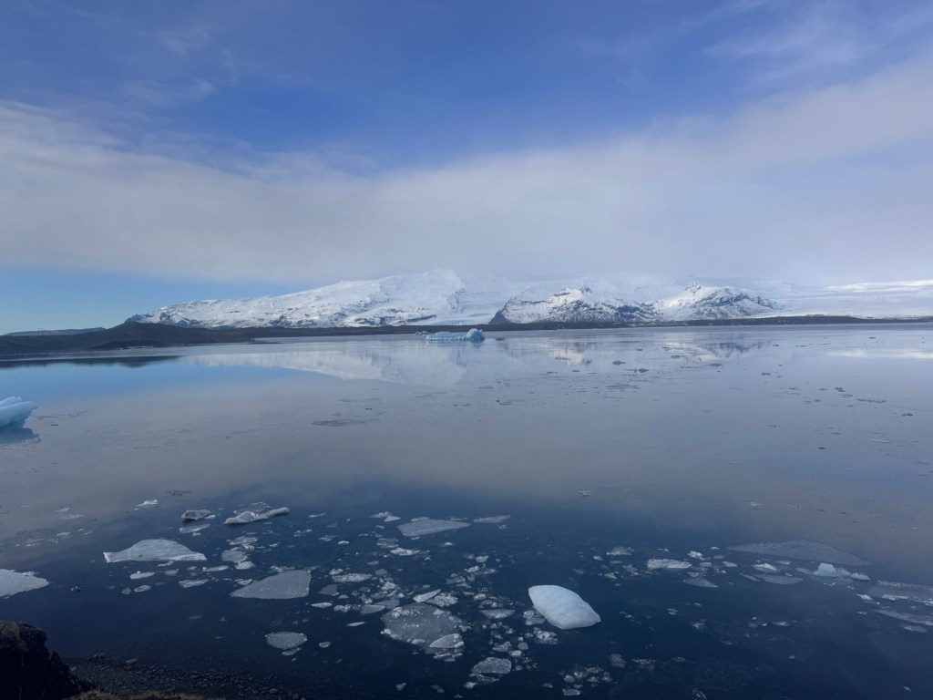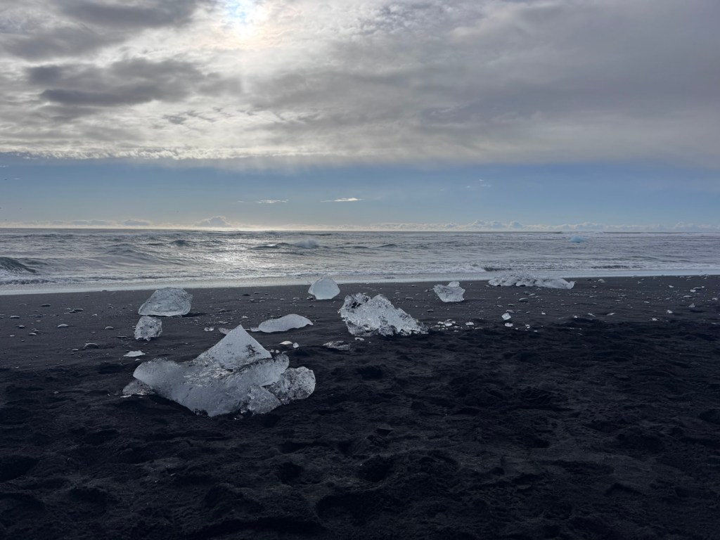 To start the fifth day of the trip, we headed to Jökulsárlón. This lagoon formed as the Breiðamerkurjökull glacier has retreated over time. The lagoon had beautiful blue water and was filled with large floating icebergs. Many of these icebergs slowly drift toward the ocean, where waves sometimes push pieces back onto the nearby black sand beach known as Diamond Beach. Seeing the chunks of ice sitting on the dark sand was really impressive, and I was also able to spot a few seals swimming and playing in the current.