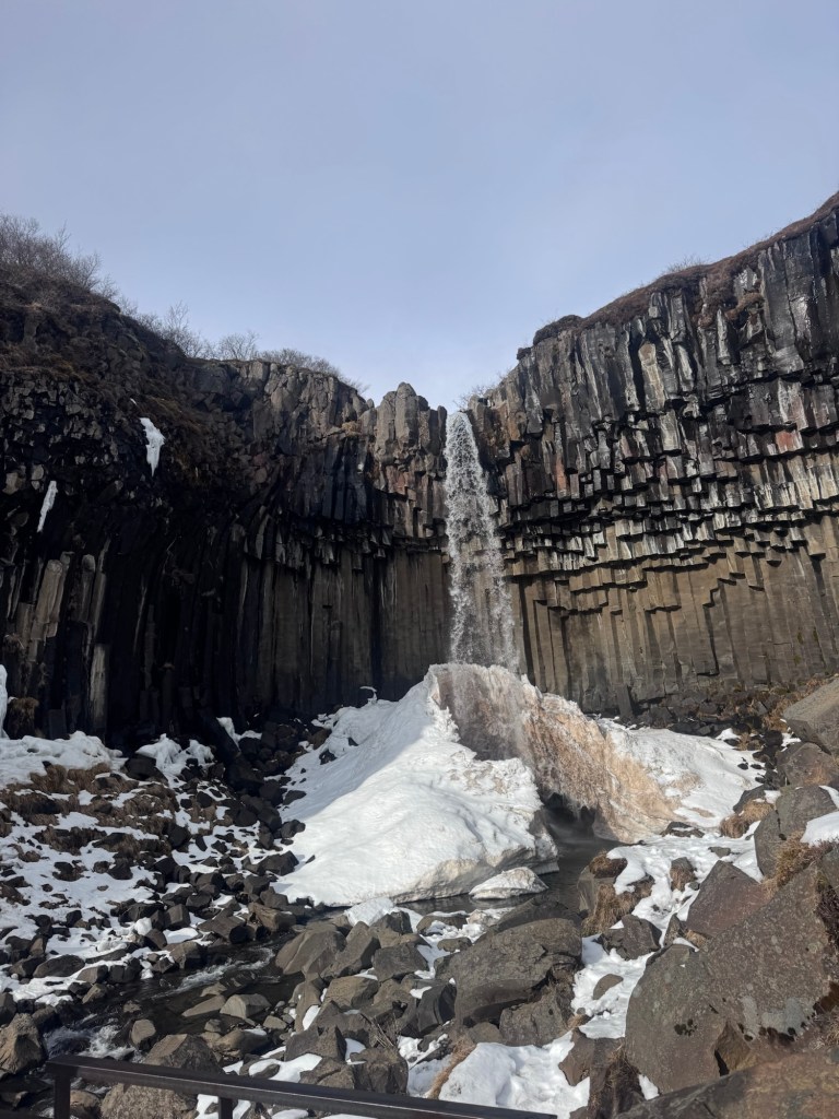 After that, we traveled to Fagurhólsmýri and went on a hike to see a waterfall. This waterfall was especially interesting because it had striking basalt columns, which formed when lava cooled and cracked into geometric shapes.