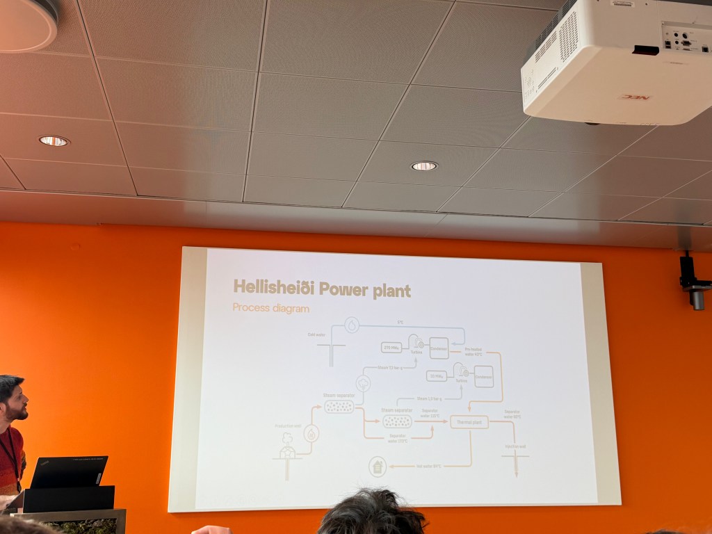 Later in the day we visited the Hellisheioi Power Plant geothermal exhibition, which was honestly one of the coolest engineering sites we’ve seen on the trip. The power plant uses geothermal energy from deep underground reservoirs created by Iceland’s volcanic activity. Hot water and steam rise through wells drilled into the earth, and that steam is used to spin turbines that generate electricity. After the steam passes through the turbines, the remaining hot water is also used for district heating, sending heat through pipelines to homes in Reykjavik.