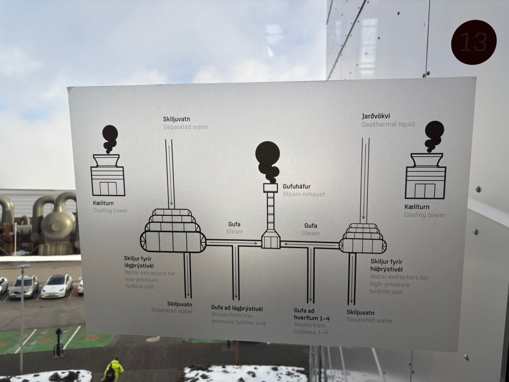 Later we arrived at the Hellisheiði geothermal power plant, where we learned how Iceland uses geothermal energy to produce electricity and heat. This is done as hot geothermal steam is brought through the production well through the steam separator, then put through a turbine where it spins generators to produce the electricity for heating homes and water.