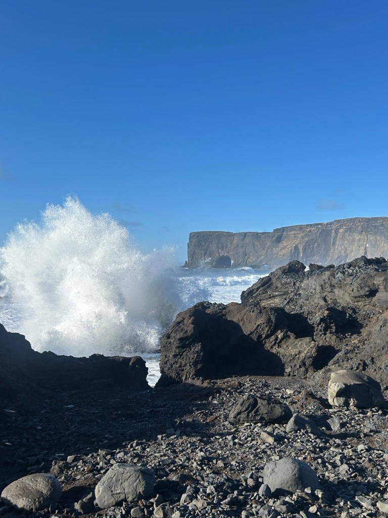 Today we left our hotel on the Southern Coast of Iceland to travel back to Reykjavik. We reached the southernmost tip of Iceland for some scenic views. The black sand beach has some extremely powerful waves, called Sneaker Waves, that splashed over the rocks. There also was a cool bridge like basalt formation. Basalt is super prevalent on Iceland.