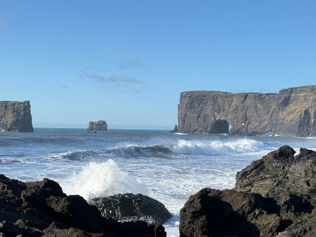 Day 6 started with a visit to the southern most tip of Iceland. We arrived to black beaches, gigantic waves, and ocean that seemed to go on forever. Behind this beautiful scenery were sneaker waves that would seem to grow in size as they got closer to the shore and drag you out the way they came. Even from the cliffs we could hear the force caused by these waves. When we turned around we could really get an idea of how scenic Iceland was. To our front were black sand beaches and behind us were snowy mountains and a volcano that could erupt at any time. After our trip to the southern tip of Iceland, we headed to a geothermal power plant. While there they let us tour their facility and take a look at where they took out the hot water to produce energy and hot water. After our tour of the geothermal power plant, we went to our new hotel in Reykjavik. We all went to unpack our bags and head out for dinner which we had scheduled a couple night before. I got some tiger shrimp that I couldn’t get enough of. After dinner, we celebrated a couple of our classmates birthdays with marshmallow covered chocolate and candies. Then we all headed back to our hotel to finish off the day.
