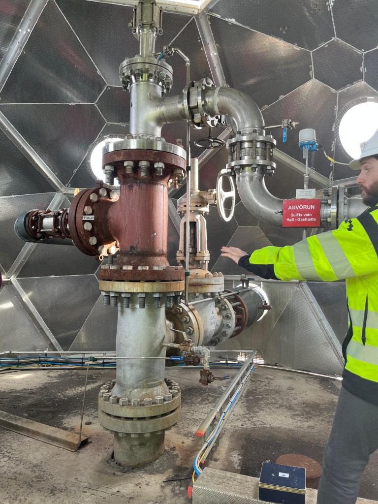 Heated water is a huge demand from Reykjavik, so after the steam is sent through the turbines, it goes to the thermal plant. Here, the clean hot water is prepared to be sent 25km to Reykjavik, while the impurities (carbon dioxide and hydrogen sulfide) are dissolved in (slightly hotter) water to be reinjected into the ground. We took a look at one of the reinjection wells on the geothermal field. The process goes on 24 hours a day, 7 days a week to give the capital region of Iceland electricity and hot water.